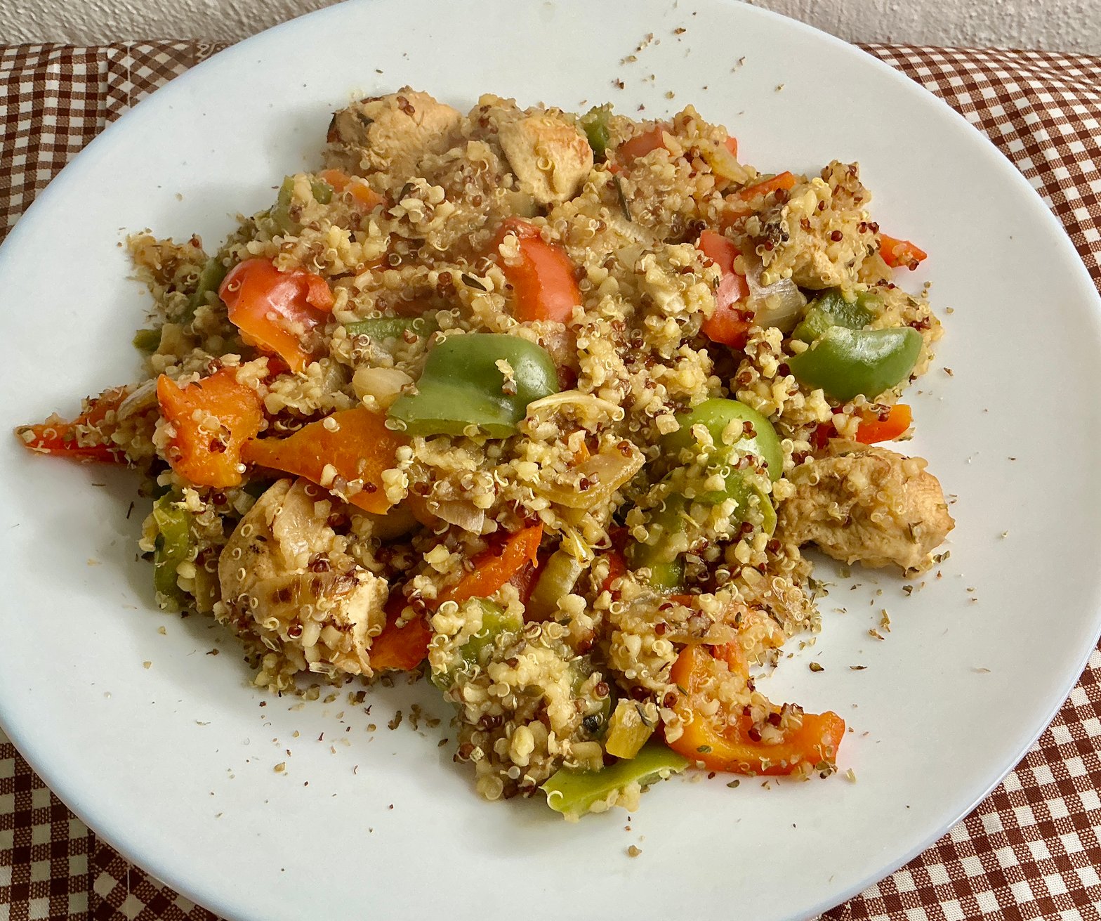 Rajouter ensuite les poivrons, le quinoa et mettre de l’eau pour que le quinoa soit bien recouvert