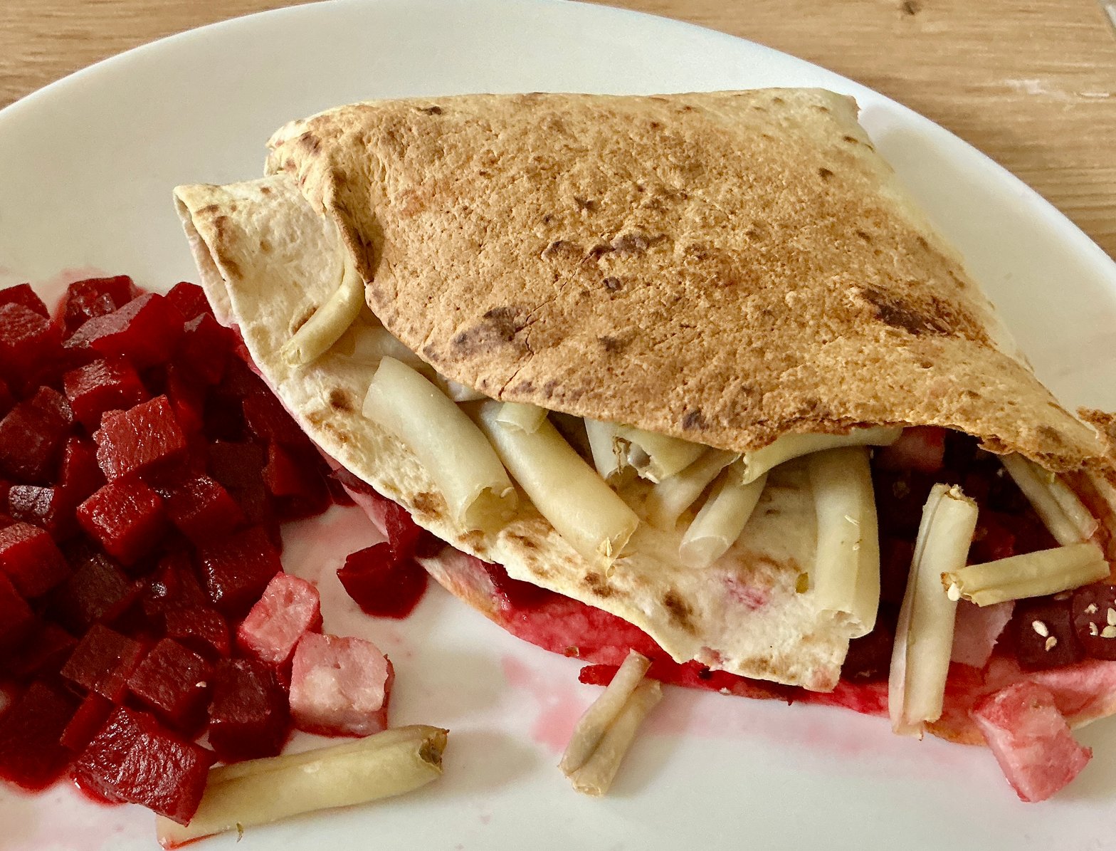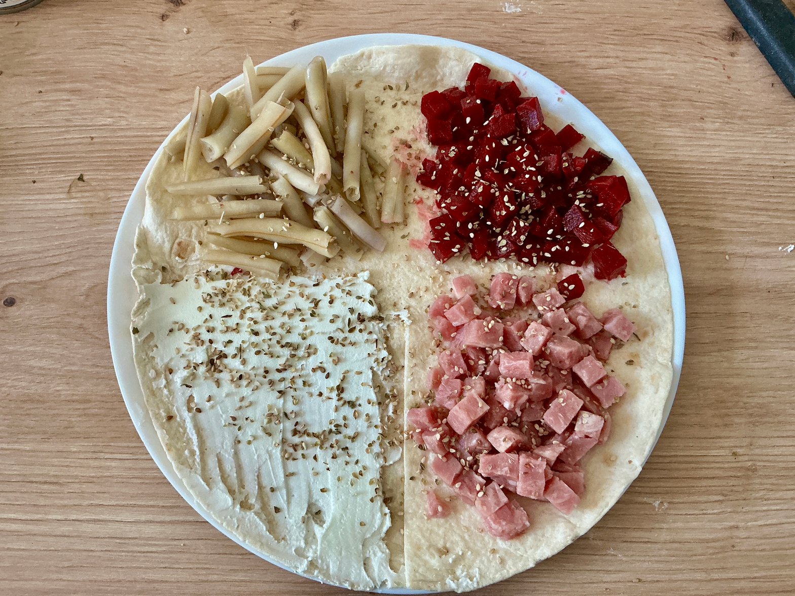 Assaisonner suivant vos goûts, quelques graines au choix et ensuite replier le wrap: partir du bas à droite, remonter jusqu’en haut a droite, puis haut a gauche et finir par en bas a gauche.