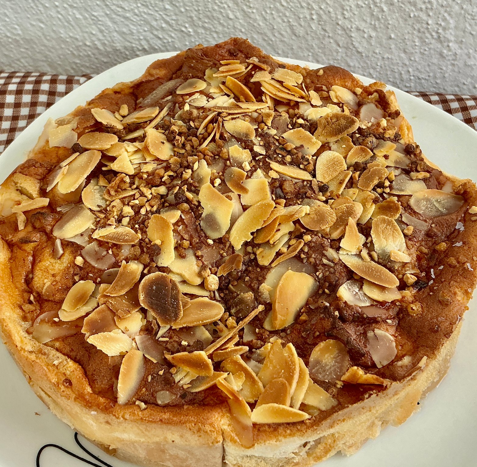 Rajouter les pommes coupées en fins morceaux, répartir dans un moule ( 20 cm max) et mettre quelques amandes effilées dessus
