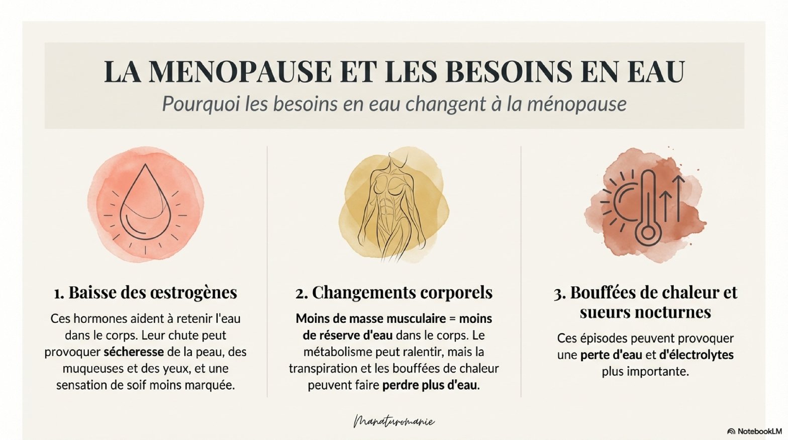 La ménopause entraîne une modification des pertes et apports hydriques.