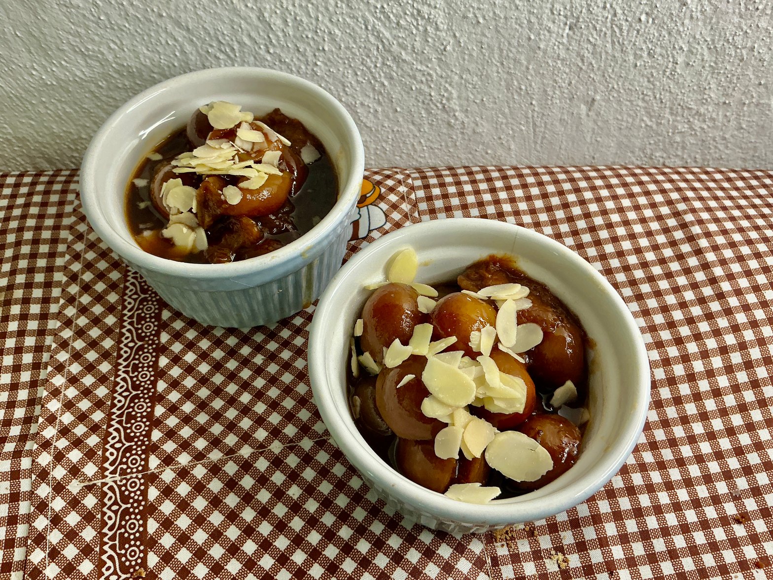On fait d’abord revenir les mirabelles dans l’huile, au bout de quelques minutes, on ajoute le sucre de coco, puis les deux cuillères à soupe de fleur d’oranger et extrait de vanille.