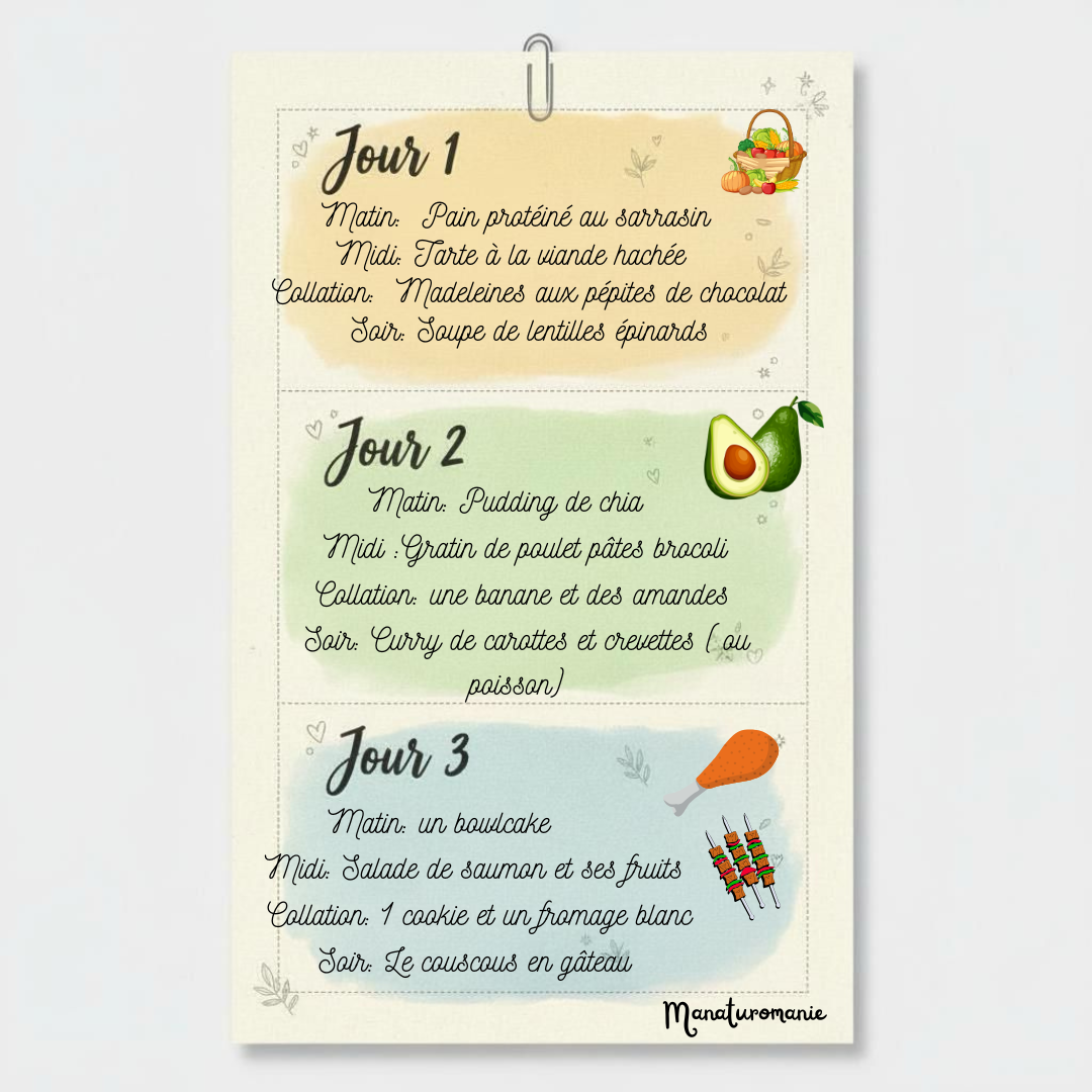 Ces journées sont adaptées pour des journées à environ 1500/1600 calories si vous rajoutez des desserts. ( mais vous ajustez suivant vos besoins, je sais que c'est une moyenne utilisée par beaucoup de femmes. )
