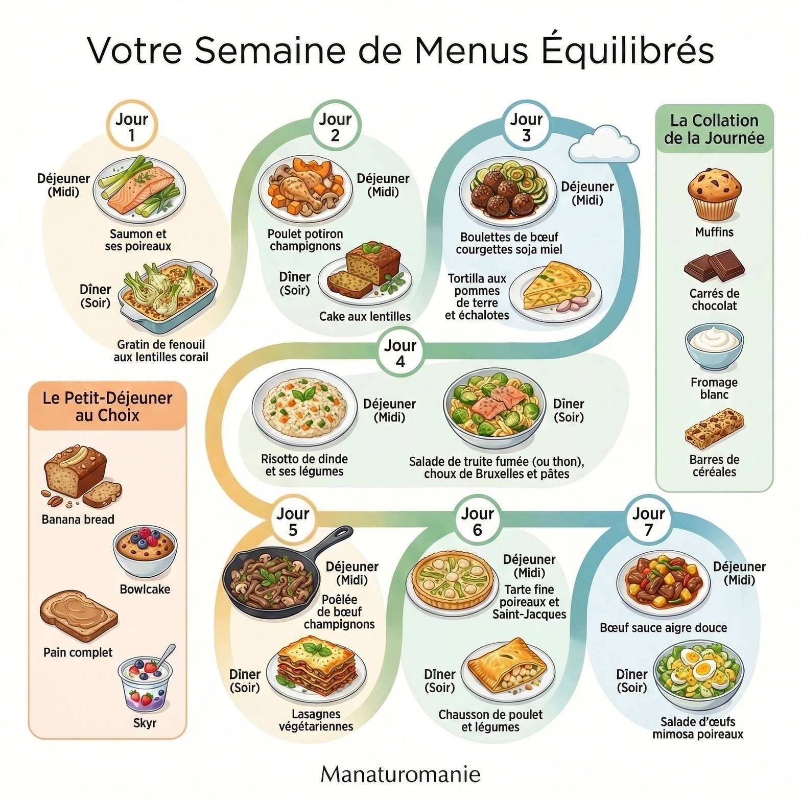 voici de nouvelles idées repas pour 7 jours pour vous aider à combiner vos assiettes en variant surtout les protéines ( on mange souvent la même chose et trop de viande rouge ou de porc)