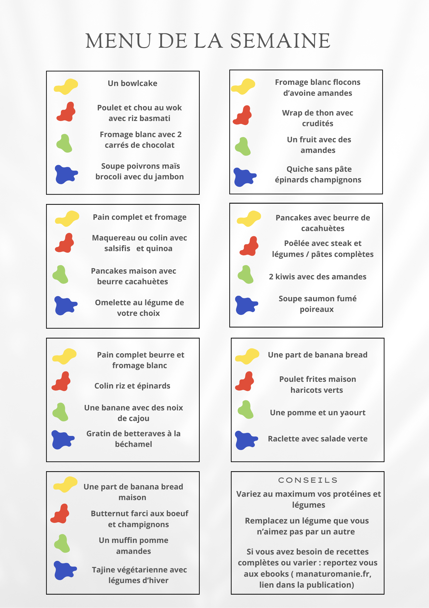 N’oubliez que aucun menu n’est à suivre à la lettre il faut que vous adaptiez aux aléas de la vie, à vos besoins donc en soit savoir équilibrer.